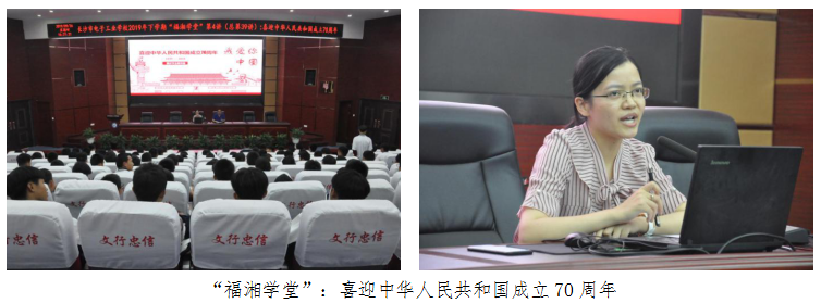9月26日下午,“福湘学堂”第4讲(总第39讲)在我校开慧厅举行,学校思政课刘晓航老师为机电技术部200多新生讲了一堂以“喜迎中华人民共和国成立70周年”为主题的讲座,对学生进行爱国主义教育。