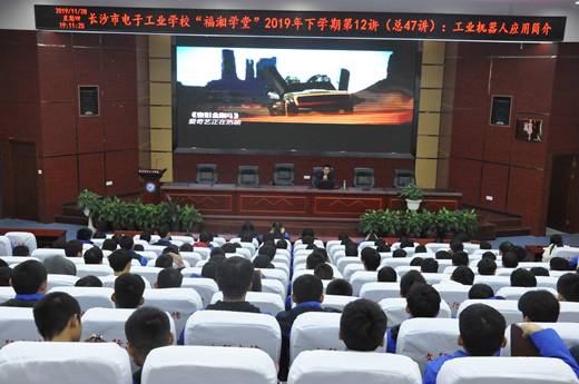 本网讯(通讯员 刘世莹)为进一步拓展学生视野,了解专业就业前景,提高学生的学习兴趣,11月28日晚,“福湘学堂”2019下学期第12讲在开慧厅开讲。我校电子专业部教师、中级电气自控工程师李伟老师以“工业机器人应用介绍”为主题,为信息部、电子部部分班级的学生带来了一场精彩的讲座。讲座由办公室副主任罗志勇主持。