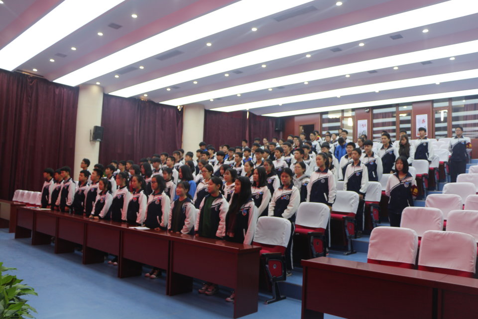 全体学生齐唱激情澎湃的国歌拉开了本次活动序幕。学生科副科长李荣斌首先发言。他引用习近平总书记关于青年的讲话“青年兴国家兴,只有青年有了担当,有了理想,国家才会强大”,向全体团员提出了三个要求:一是积极学习专业技能,对口班团员争取考上好大学;二是爱护校园环境,创建文明校园;三是多参加课外活动,积极加入社团,丰富课余生活。随后,机电部部长荣红林老师带领广大团员在团歌中回顾入团时的光荣,他说“加入共青团是一种信仰,一种承诺”,强调“青春是用来奋斗的,在青春时代选择了吃苦也就选择了收获,选择了奉献也就选择了高尚”,并要求全体团员要爱学习,多读书,弘扬优秀传统文化。