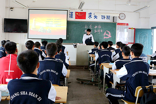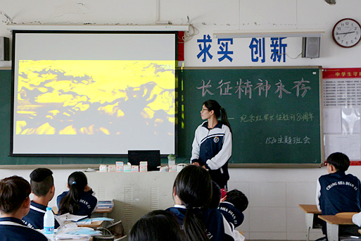 这次主题班会各班认真准备,收集了很多教育素材,活动形式多样。有的班级制作了精美的幻灯片,班主任老师认真讲述红军长征的光辉历史;有的班级播放长征影视照片,通过镜头回顾长征的伟大历程。