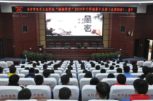 本网讯(通讯员 王雄姣)为弘扬优秀传统文化,培养学生对国学经典的兴趣,激发学生的爱国主义情怀和民族自豪感,12月26日下午,学校邀请机电部专业教师袁科炯作了一场以“墨子”为主题的专题讲座,机电部高二年级部分班级近200名学生到场聆听。讲座由办公室副主任罗志勇主持。