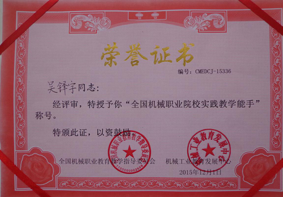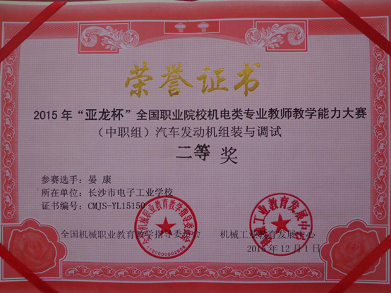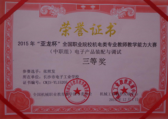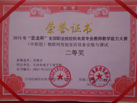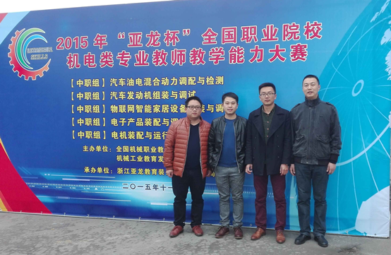 2015年12月1日在温州结束的“亚龙杯”全国职业院校机电类专业教师教学能力竞赛中,我校参赛选手吴锋宇、晏康、张照发三位老师不畏强手,认真准备,沉着应战,分获物联网智能家居设备安装与调试项目二等奖、汽车发动机组装与调试项目二等奖、电子产品装配与调试项目三等奖。
