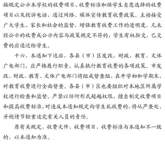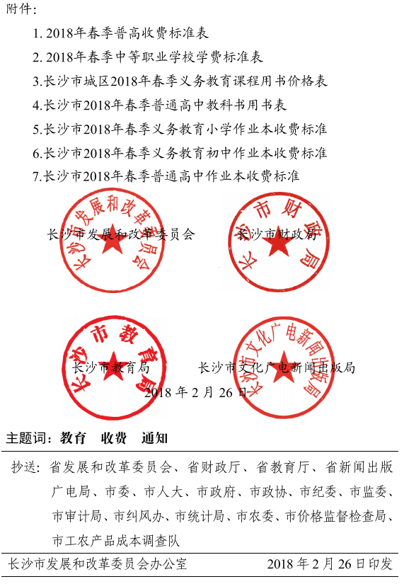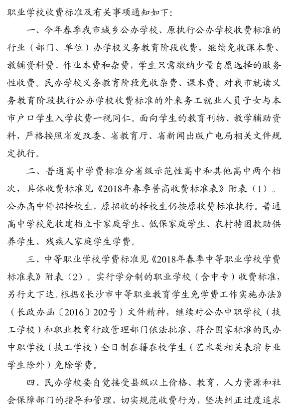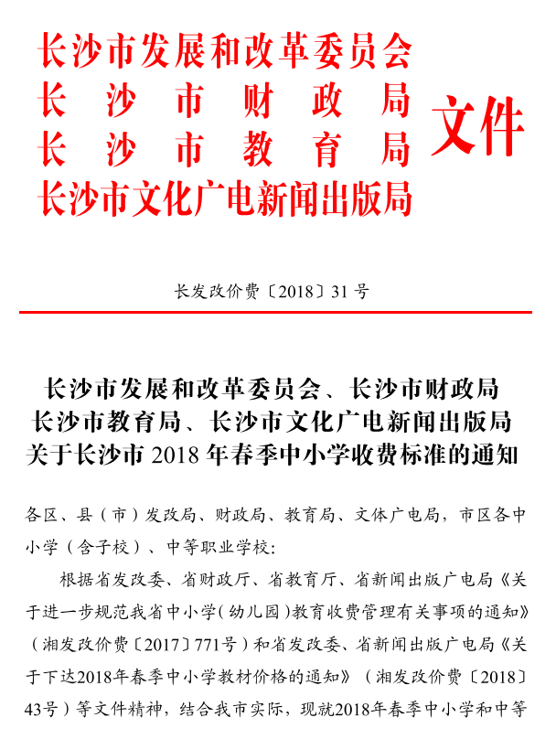 转发:《长沙市发展和改革委员会、长沙市财政局、长沙市教育局、长沙市文化广电新闻出版局、关于长沙市2018年春季中小学收费标准的通知》 来源:转发长沙市教育局 发布时间:2018-03-02 13:54:22 浏览次数: 次 【字体:小 大】 智能标签: 中小学收费标准 相关内容 分享到: 【打印正文】