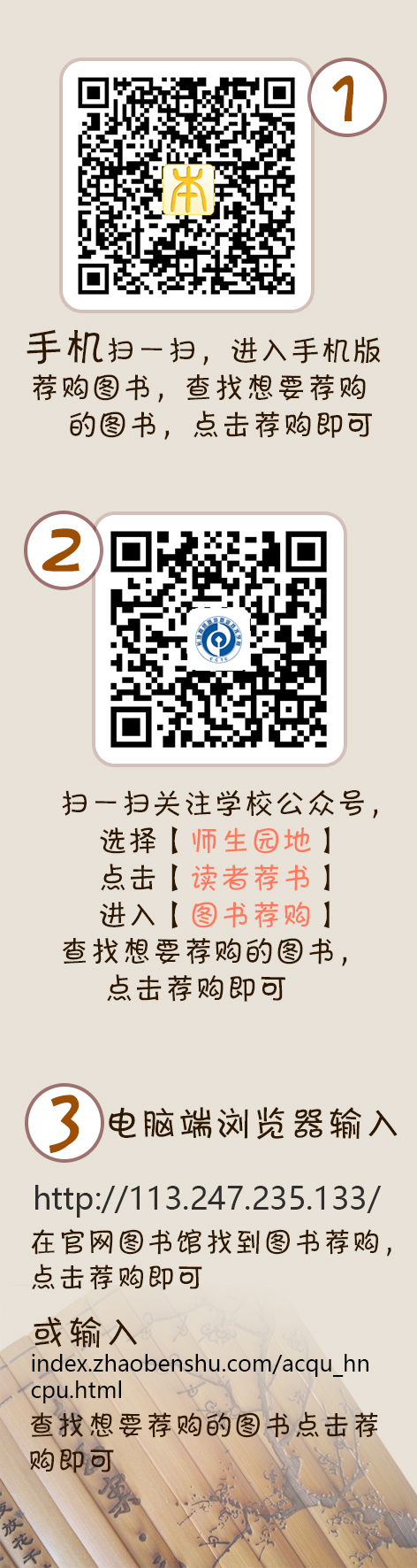 通过手机微信扫一扫下图1、图2 的二维码,进入手机版荐购图书库,或关注学校微信公众号,点击【师生园地】,进入【阅读阅美】即可荐购。(若系统提示需登录操作,请输入您的借书证号,密码111111)