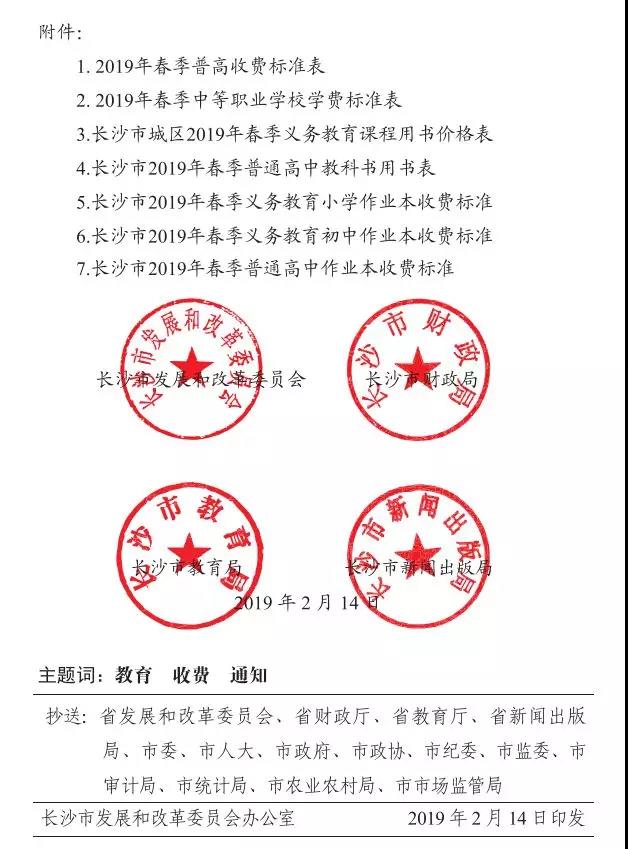 根据湖南省发改委、省财政厅、省教育厅、省新闻出版广电局《关于进一步规范我省中小学(幼儿园)教育收费管理有关事项的通知》(湘发改价费〔2017〕771号)和省发改委、省新闻出版局《关于下达2019年春季中小学教材价格的通知》(湘发改价费〔2019〕41号)等文件精神,结合我市实际,现就2019年春季中小学和中等职业学校收费标准及有关事项通知如下:
