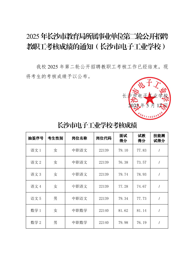 2025年长沙市教育局所属事业单位第二轮公开招聘教职工考核成绩的通知