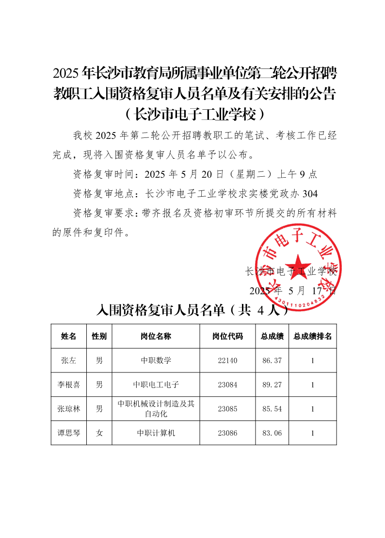 2025年长沙市教育局所属事业单位第二轮公开招聘教职工入围资格复审人员名单及有关安排的公告 来源: 发布时间:2025-05-17 13:07:10 浏览次数: 次 【字体:小 大】 终审:dzb 分享到: 【打印正文】