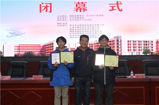 随后,长沙市教科院副院长赛项执委会负责人涂立奇宣布竞赛成绩,与会领导为获奖选手一一颁发获奖证书和奖牌。