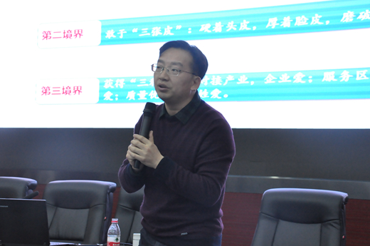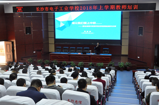 周处长报告的主题为《谁让我们爱上中职--推动湖南中职教育发展的些许分享》。首先,他以王国维论人生的“三重境界”作类比,谈了湖南中职教育的“三重境界”,他希望全体职教工作者以“忍”、“持”、“悟”的工作态度,在面对“三个最”时,要敢于“三张皮”,最终获得“三种爱”,推动中职教育健康发展;随后,他分别从良心站位、政治站位、专业站位三个视角谈了我们应该怎么看待现阶段中职教育,让全体教职员工对现阶段中职教育的特殊性,重要性有了更充分的了解,增强了大家服务中职教育的信心和动力;最后,周处长为我们回顾了省里2017年是如何以“三抓三改一突破”为抓手,推动湖南中职教育上台阶、提升在全国知名度的。同时,也向我们分享了2018年省里将会如何以“稳定规模”、“化解风险”、“改善条件”、“狠抓质量”、“推出亮点”为手段助推我省中职教育更上一层楼。并希望全体职教工作者本着对领导负责、对产业负责、对群众负责、对自己负责的态度努力工作,用自己的实际行动为中职教育发展贡献力量。周处长一个半小时的报告充满激情,语言风趣幽默,逻辑严密,例证详实,他展现出的对职业教育的爱及信心深深地感染了我们。