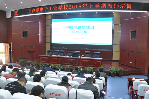 紧接着,徐景学教授为我们做了以《中职卓越校建设重点剖析》为主题的讲座。首先,他从起源、目的和计划实施的关键三个方面为我们详细介绍了湖南省的卓越校建设计划,让全体教职工对卓越校建设有了更清晰的认识;随后,他分别从专业建设、教师队伍建设及治理能力建设三个方面为我们详细剖析的卓越校建设的重点,让我们的目的和方向更加明确;最后,他提出了几点卓越校申报的建议:一是加强学习调研,充分理解文件要求;二是专业调整先行,力求做实;三是加强方案的顶层设计;四是在申报工作的组织过程中,既要全校造势,又要发挥关键少数(骨干)人的作用,材料撰写与日常工作紧密结合,方案侧重于宏观目标和中观的思路,任务书着重于任务的落实等。徐教授严谨、专业的讲座为我们的卓越发展指明了方向。