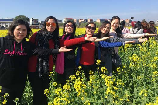 中餐后,老师们又兴致勃勃来到了浏阳油菜花基地,欣赏金灿灿的油菜花,置身金色花海,远离城市喧嚣,尽情投入大自然的怀抱,享受农田野趣。清新的环境一下子让平日工作繁忙的老师们放松下来,纷纷拿出相机合我校女教师影留念,留住这大好春光。