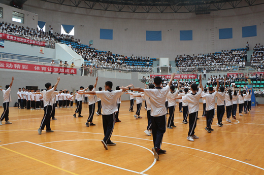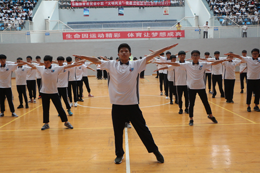决赛现场,随着学生科孙仕要科长宣布比赛开始,以及熟悉而又轻快的广播操音乐的响起,同学们精神抖擞,气宇轩昂,从预备节到整理运动,双手前平举、侧平举,扩胸,抬脚,弯腰,转身,跳跃等动作整齐划一,优美大方,动作张弛有度,充盈着刚健之美,洋溢着青春之美,飞扬着动人的神采。参赛班级的同学们用自己的举动展示了追求卓越的信念与力量。