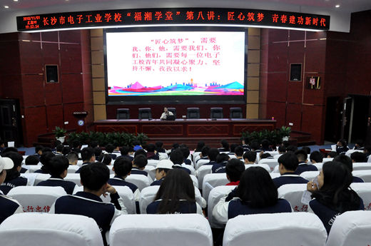 本网讯(通讯员 甘元智)何为“工匠”?“工匠精神”的精髓又是什么?如何让“工匠精神”深入人心?11月1日,“福湘学堂”第八讲上,校团委书记刘菁以“匠心筑梦--青春建功新时代”为主题,一一为大家做了解答,办公室副主任甘元智主持,来自电子技术部高二5个班的学生接受了“工匠精神”的洗礼。