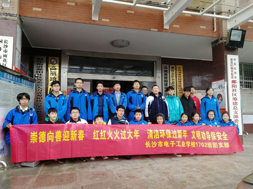 本网讯(通讯员 周灵芝)春节将至,为培育和践行社会主义核心价值观,积极响应上级文件精神,进一步营造学雷锋志愿服务的浓厚氛围,推动“邻里守望”(关爱他人、关爱社会、关爱自然)志愿服务活动持续深入开展,在校党委的领导和校团委的指导下,1月14号中午,1702班团支部22名同学在团支部指导员周灵芝老师的带领下,一同前往雨花区洞井街道鄱阳社区开展以“崇德向善迎新春 红红火火过大年”为主题的清洁环保类学雷锋志愿服务活动。