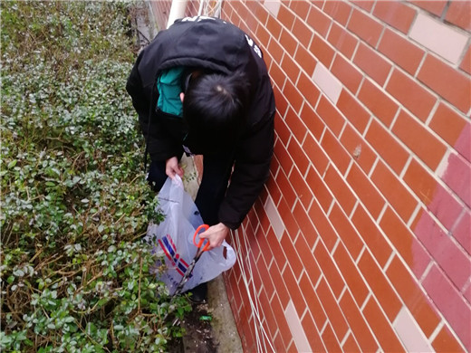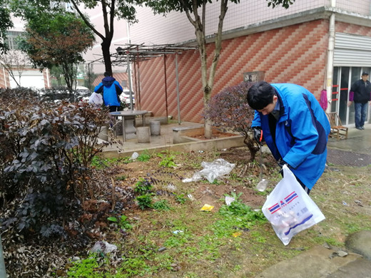 正值年底隆冬时节,天气寒冷,细雨霏霏,但挡不住同学们参与志愿服务活动的热情。在社区工作人员的引导下,同学们分为三个小组,前往指定的华美佳园小区进行环保清洁活动。他们一手拿火钳一手提垃圾袋穿梭在小区绿化带,将绿化带内平时难以清扫的白色塑料垃圾、饮料瓶进行捡拾和收集。有些不便清理的卫生死角,散发着恶臭,但并未阻挡同学们清理的决心,他们团结协作,很快就将垃圾清理干净。此外,同学们用小铲子对小区内乱贴的小广告进行了清理。