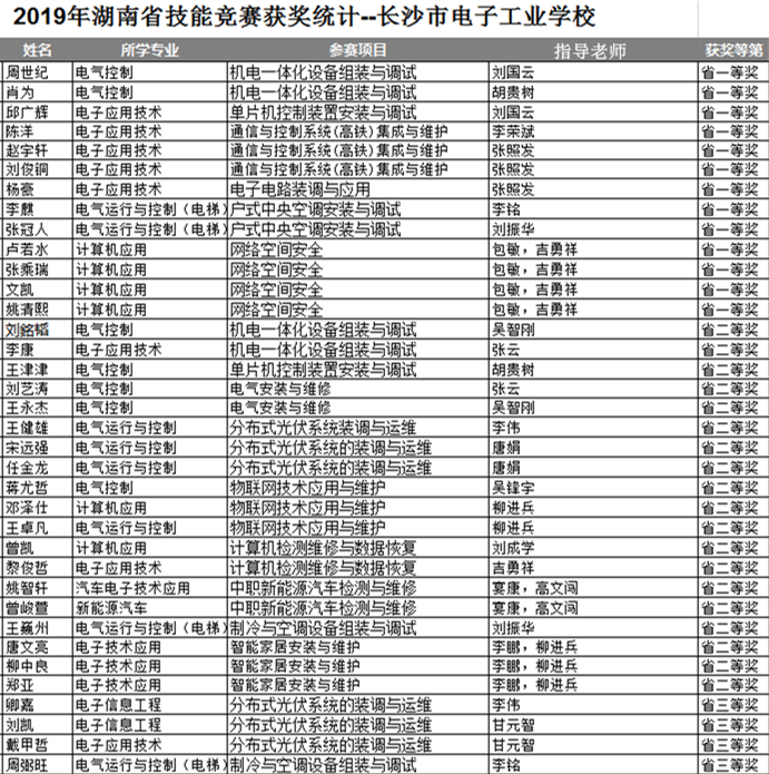 此前,湖南省2019年职业院校技能竞赛第一阶段于2018年12月下旬落下帷幕,7530名在校学生在102个赛项上同台竞技,电子学子尽显“风流”,成绩斐然。截至目前,湖南省2019年职业院校技能竞赛已接近尾声,我校参赛项目也已全部完成,共获得18枚奖牌,其中7枚金牌,9枚银牌,2枚铜牌,奖项数超过往年,创历史最好成绩。入围国赛集训的项目共有9个,分别是:机电一体化设备组装与调试,通信与控制系统集成与维护,分布式光伏系统装调与运维,计算机检测维修与数据恢复,网络空间安全,中职新能源汽车检测与维修,液压与气动系统装调与维护,制冷与空调设备组装与调试,智能家居安装与维护。其中,我校承接了2019年全国职业院校技能大赛中职机电一体化设备组装与调试、中职通信与控制系统集成与维护两个赛项的集训工作。