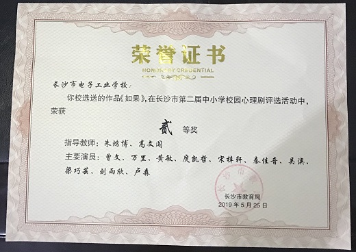 本网讯(通讯员 朱鸿博)日前,历时一个多月的长沙市第二届中小学校园心理剧大赛圆满落下帷幕。各区、县(市)和中小学全面发动,认真组织,层层选拔,最终提交原创校园心理剧249个。经过区县推荐、市级专家评选,最终评出优秀作品45个,其中中学组一等奖10名、二等奖9名、三等奖8名;小学组一等奖5名、二等奖8名、三等奖5名。我校原创心理剧作品《如果》喜获二等奖。这也是我校首次参加校园心理剧大赛。