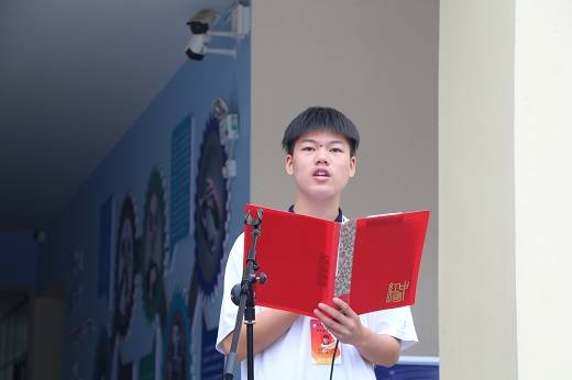 随后,学生代表1811班戴威同学上台发言。他说,“而今的我们已不再是稚气未脱的孩童,一个个懵懂无知的少年早已锤炼为焕发青春气息的中学生。我们有自己的理想和目标,也有面对一切艰难险阻的信心和勇气,我们深知:既然选择了远方,便只顾风雨兼程。我们坚信,接下来的几年光阴将因自己的不懈奋斗而意义深远、光彩夺目!”