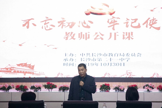 本网讯(通讯员 罗迪)10月30日下午,长沙市教育系统第五片组“不忘初心、牢记使命”教师公开课在长沙市第二十一中学隆重举行。此次教师公开课旨在进一步深化“不忘初心、牢记使命”主题教育实效,大力宣传优秀教育工作者的教育初心与使命,引导广大教师争做新时代的“四有”教师。长沙市教育局党委委员、工会主席、主题教育第五组组长陈仕强莅临公开课现场,我校党委书记李志彬、主题教育办公室成员及20位党员教师代表参与听课。公开课现场高潮迭起,来自八所学校的授课教师为观众呈现了八堂各具特色的精彩公开课。