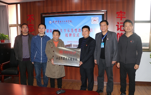 本网讯(通讯员 林干祥)11月20日上午,湖南师范大学正式授予我校“示范性教育实践基地”称号,授牌仪式在2-411会议室举行。出席此次授牌仪式的领导和带队老师有:湖南师范大学信息科学与工程学院刘宏副院长、周劲松副书记、付玉教授等,工程与设计学院彭可副院长、张建军副主任、盛艳老师等。我校党委书记李志彬,副校长张湘吉、贺今海共同出席了授牌仪式,授牌仪式由教务科长林干祥主持。