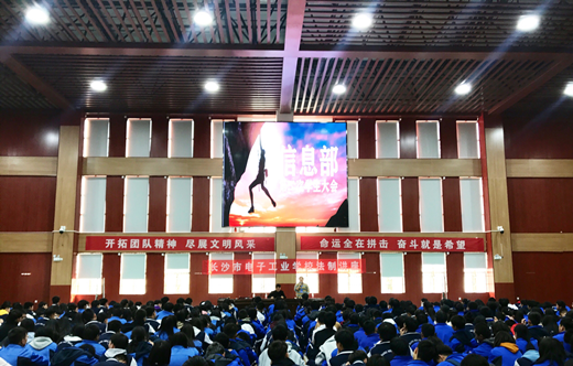 首先,王部长通过五个“回头看”——长沙市学生技能竞赛、校运动会、研学活动、期中考试和学生违纪情况等,对上半学期的工作进行总结,肯定了同学们在团体操、校运会、研学等活动中的表现,特别表扬了在长沙市技能竞赛为校争光的学生,经过大家的刻苦努力,我校获计算机类团体总分第二名,其中6个赛项入围省赛。随后,王部长对后阶段工作进行安排部署,要求学生树立“四个意识”——安全意识、法律意识、规矩意识、责任意识,希望信息部所有学子严格遵守学校各项规章制度,成为健康、快乐、向上的中职生。