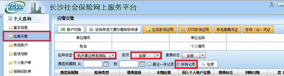 第一种情况查询:一直在长沙市属机关事业单位的人员,个人缴费时间段为19977月至20068月(电子技校至20098月),机关事业单位的养老个人缴费部分(对应费款所属期)需连贯。
