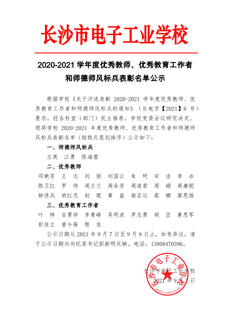 2020-2021学年度优秀教师、优秀教育工作者和师德师风标兵表彰名单公示 来源: 发布时间:2021-09-07 17:16:26 浏览次数: 次 【字体:小 大】 终审:dzb 分享到: 【打印正文】