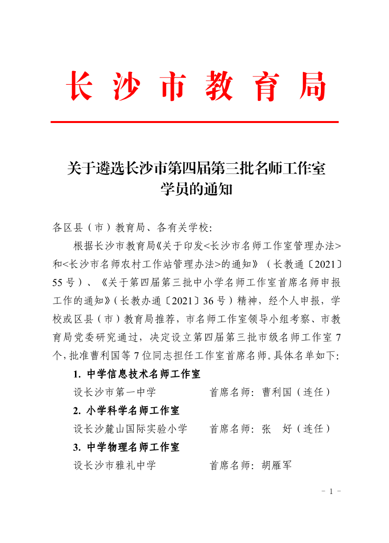 关于遴选长沙市第四届第三批名师工作室学员的通知