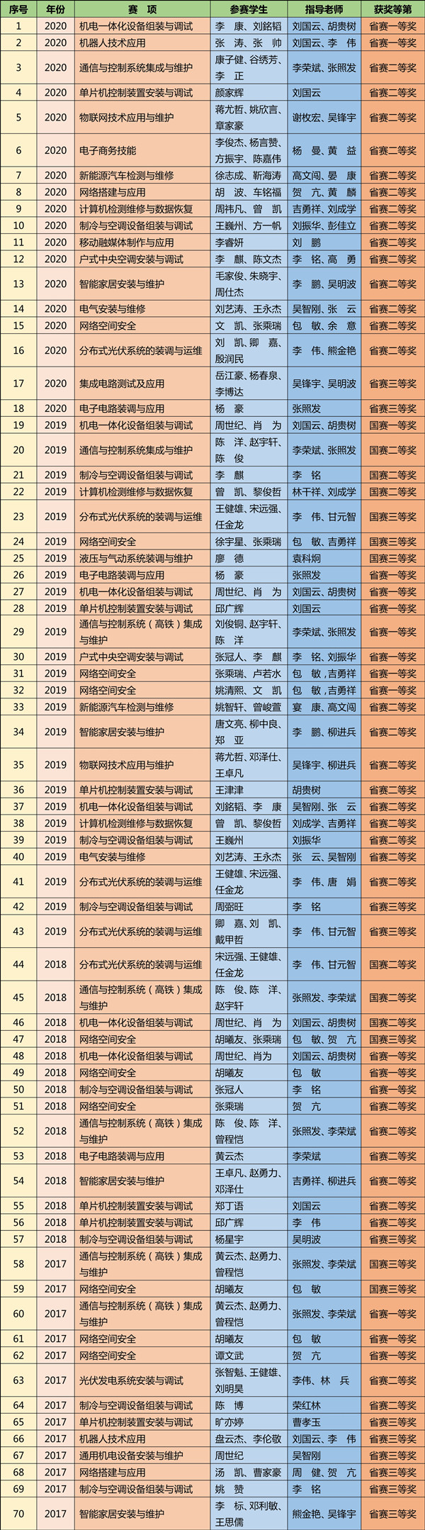 学校开设了以弱电为主的电子技术类,以强电为主的机电技术类,以计算机为主的信息技术类的三大类专业,其中,“电子+智能”专业群和“计算机应用”专业群分别为省、市立项建设的示范性特色专业群,电子技术应用专业是首批国家级重点建设示范专业、湖南省精品专业和重点建设示范专业。近年来,学生参加技能大赛荣获国家级金、银、铜牌十多枚,省级金、银、铜牌五十多枚,2019年国赛成绩中职组排名全省第一。