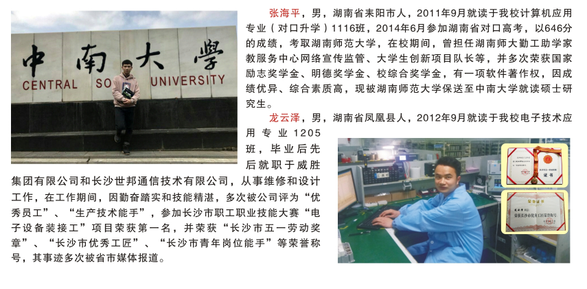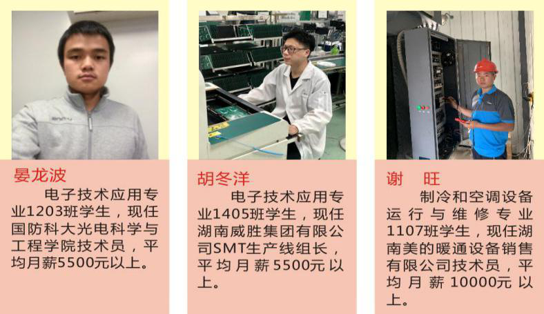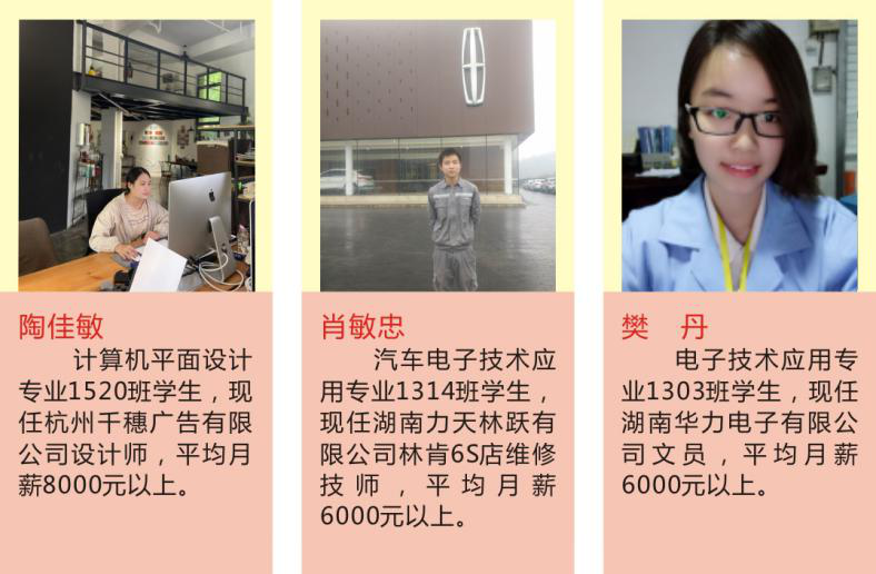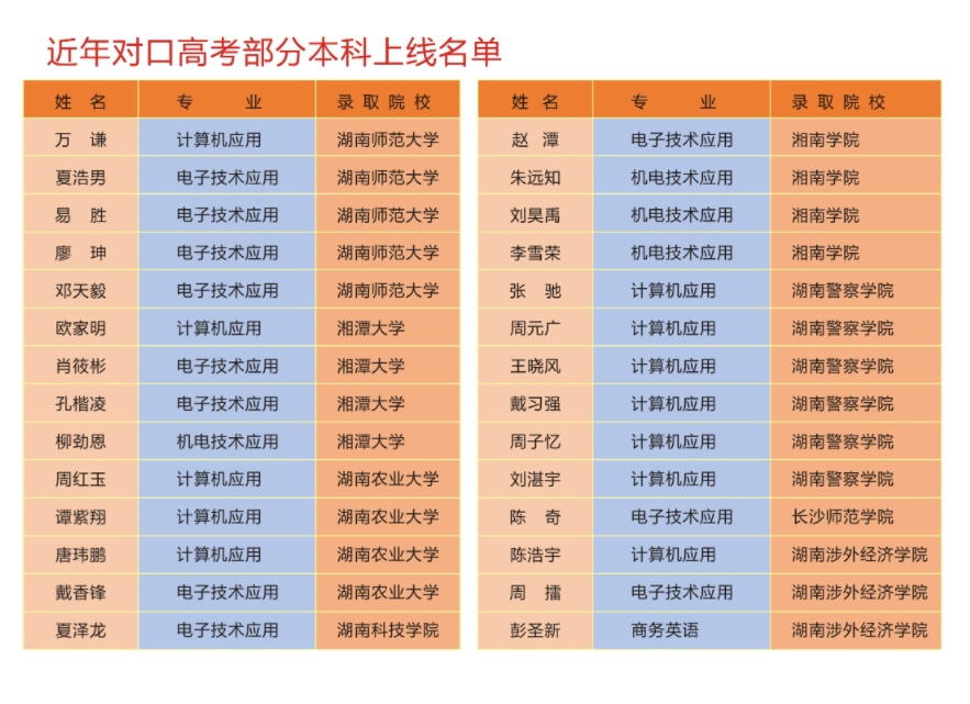 学校对口升学班,二本以上上线率历年均超过50%,专科上线率100%。我校有四个对口升学热门专业:电子技术应用、机电技术应用、商务英语、计算机应用。学生通过全省对口高考和高职院单招两种方式,可以就读湖南师范大学、湘潭大学、湖南农业大学、湖南工业大学、湖南女子学院、湖南警察学院等60余所本、专科院校。注:就业班有意向参加对口高考或高职院单招的学生,学校可组织报名,参加全省对口高考或高职院单招考试。